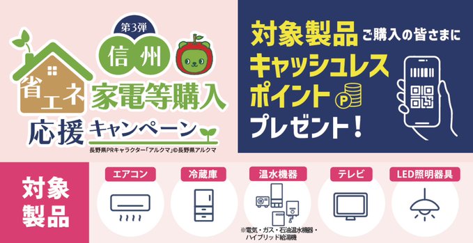 「信州省エネ家電等購入応援キャンペーン第3弾」により、対象の省エネ家電を購入することで、お得なポイント還元を受けることができます。