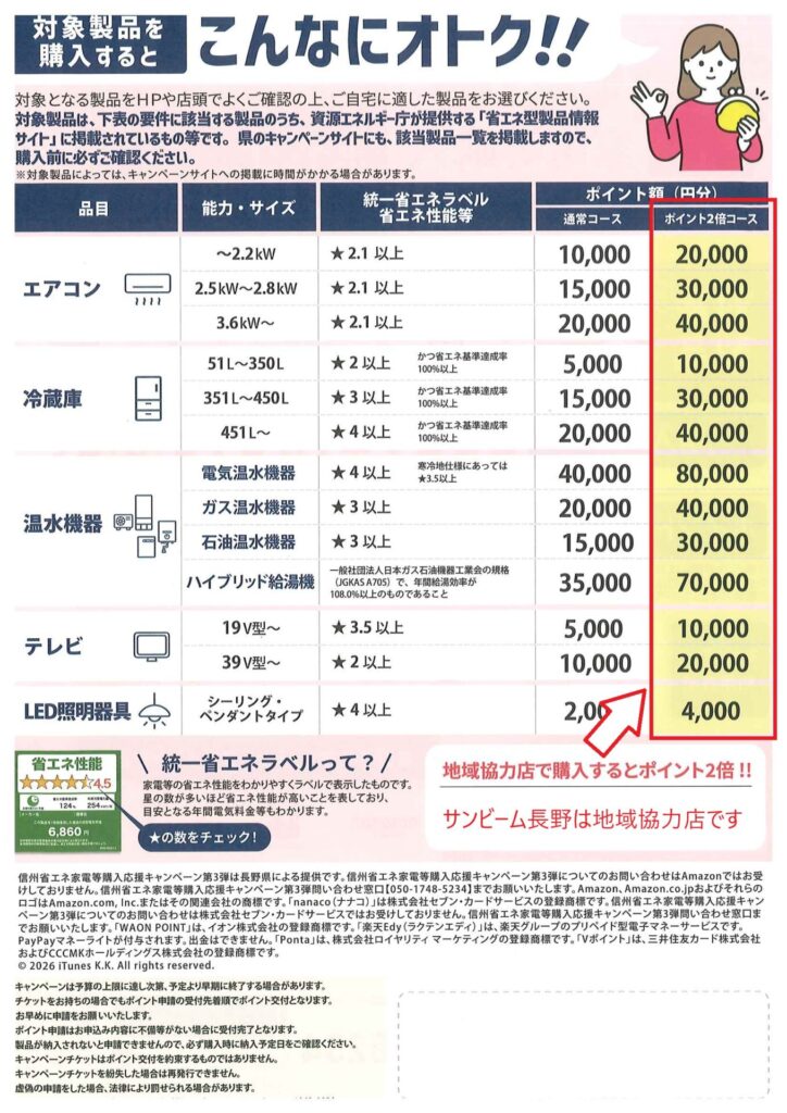 お知らせ2026年4月4日信州省エネ家電等購入応援キャンペーン第3弾が始まります。